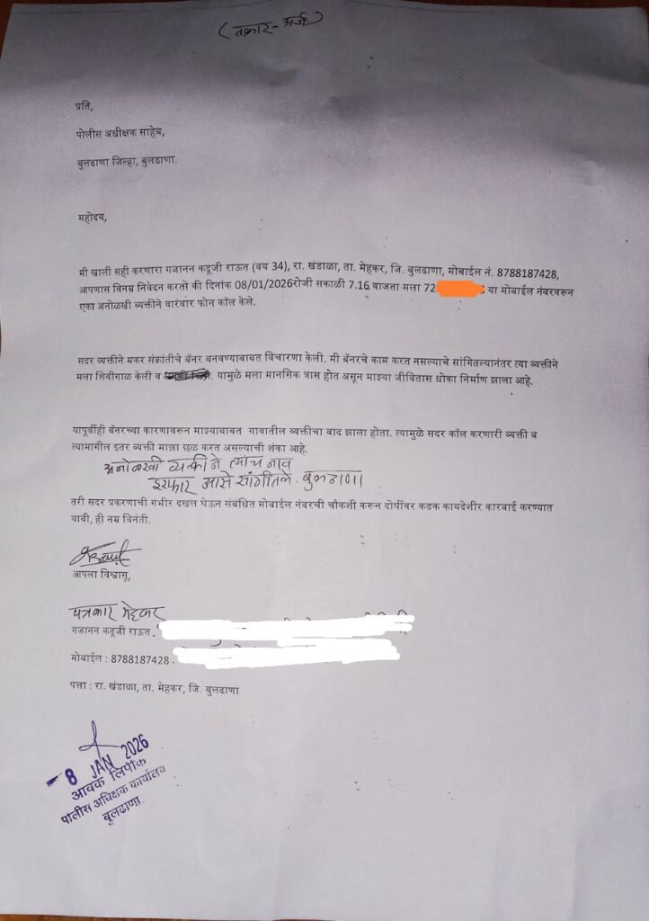 मिळालेल्या माहितीनुसार, दिनांक ०८जानेवारी रोजी सकाळी ७.१६ वाजताच्या सुमारास गजानन राऊत यांच्या मोबाईलवर एका, अनोळखी क्रमांकावरून वारंवार फोन कॉल आले. कॉल करणाऱ्या व्यक्तीने मकर संक्रांतीचे बॅनर बनवण्याबाबत विचारणा केली. की भाऊचं बॅनर बनवायचं मात्र त्यांनी त्या व्यक्ती ला सांगितले मी बॅनर बनवण्याचे काम करत नाही असे सांगितल्यानंतर संबंधित व्यक्तीने उद्देशपूर्वक अश्लील शिवीगाळ केली आसे निवेदनात नमूद करण्यात आले आहे.