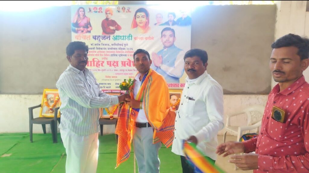 बुलढाणा मेहकर तालुक्यातील शहापूर येथे आज दिनांक १२ जानेवारीला महापुरुषांच्या जयंतीचे अवचित साधुन प्रथंमच शहापूर येथील विठ्ठल रुखुमाई मंदिरा मध्ये मा.जिजाऊ, सावित्रीबाई फुले, स्वामी विवेकानंद यांच्या जयंतीनिमित्त आयोजित कार्यक्रमात मराठा. समाजाचे अँड अमोल काळे यांचा वंचित बहुजन आघाडी मेहकर तालुक्यातील पदाधिकारी ॲइ,बबन वानखेडे यांच्या नेतृत्वाखाली व इतर पदाधिकर्याच्या उपस्थितीत मध्ये पक्ष प्रवेश करून त्यांच्या विचारांना समाजात रूजवण्याचे कामकरीत असून वंचित बहुजन आघाडीच्या पदाधिकारी व कार्यकर्त्यांना विश्वासात घेऊन पक्ष प्रेवेश केला यावेळी बोलताना ते म्हणाले कि मा साहेब जिजाऊ व स्वामी विवेकानंद यांच्या प्रेरणेतून समाजातील प्रत्येक घटकाला न्याय देण्यासाठी माझा प्रवेश असुन वंचितांच्या समस्याना वाच्या फोडुन त्यांना न्याय देण्यासाठी मी सदैव तत्पर असेल वरीष्ठाच्या आदेशाचे पालन करील यावेळी वंचित बहुजन आघाडी ला कार्यक्रम करण्यासाठी स्थानिक विठ्ठल मंदीरामध्ये जागा मिळाल्याने